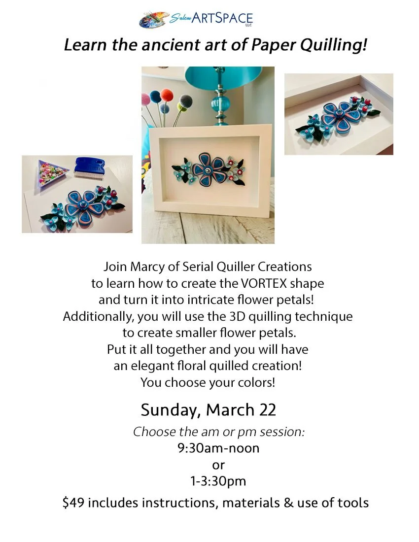 Mar 22 9:30 AM09:30 Paper Quilling with Marcy of Serial Quilling Creations Sunday, March 22, 2026 9:30 AM 12:00 PM 09:30 12:00 Salem ArtSpace, LLC (map) Google Calendar ICS 9:30am-12pm class 1pm-3:30pm class View Event →